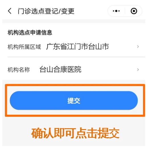 第三步:选择需要变更的定点医疗机构,完成后点击提交,系统显示“提交成功”,选点结果信息可在前端页面展示。
